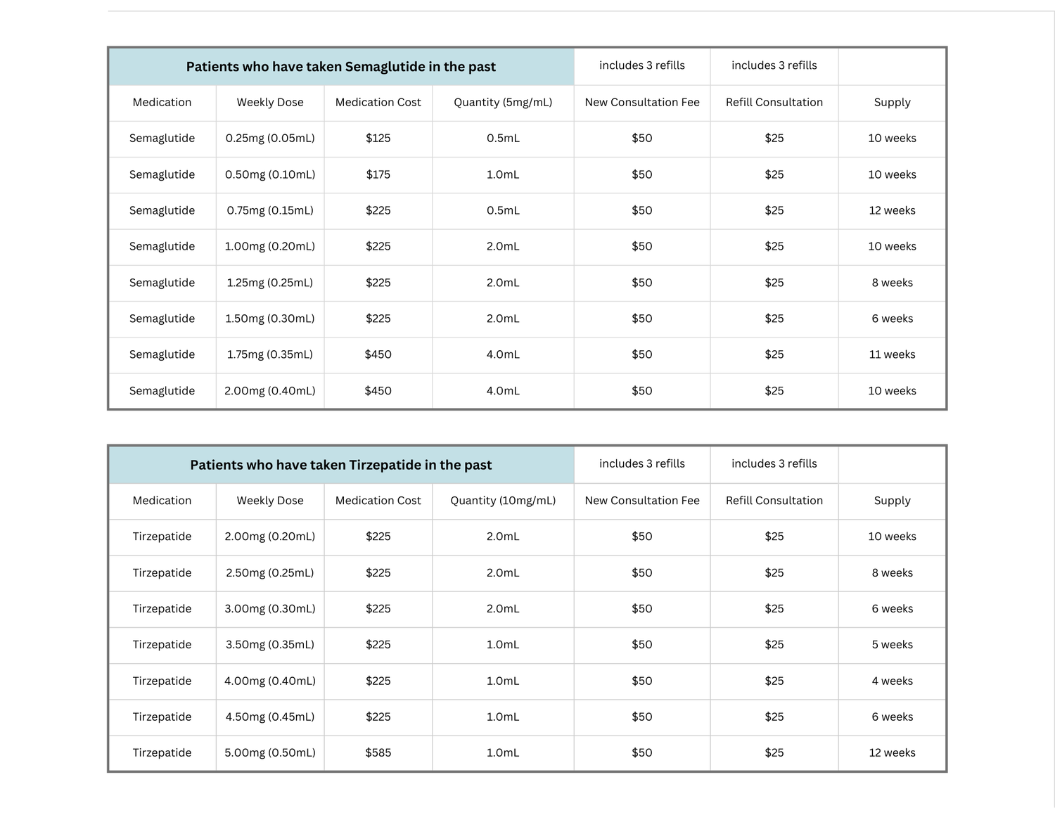 Pricing Tables for Patients who have previous experience with GLP-1 Medications: